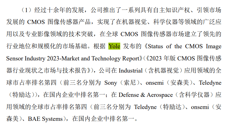 2022年Yole Group的相关报告显示,目前长光辰芯在Industrial(含机器视觉)应用领域的全球市占率排名第四,在国内企业中排名第一;在Defense & Aerospace(含科学仪器)应用领域的全球市占率排名第六,在国内企业中排名第一,是国内行业的龙头企业。
