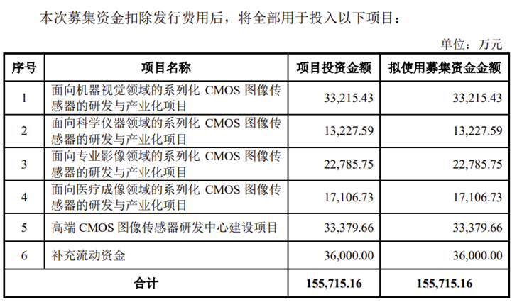 长光辰芯IPO拟募资15.57亿元,用于面向机器视觉、科学仪器、专业影像、医疗成像领域的系列化CMOS图像传感器的研发与产业化项目,以及高端CMOS图像传感器研发中心建设项目、补充流动资金。
