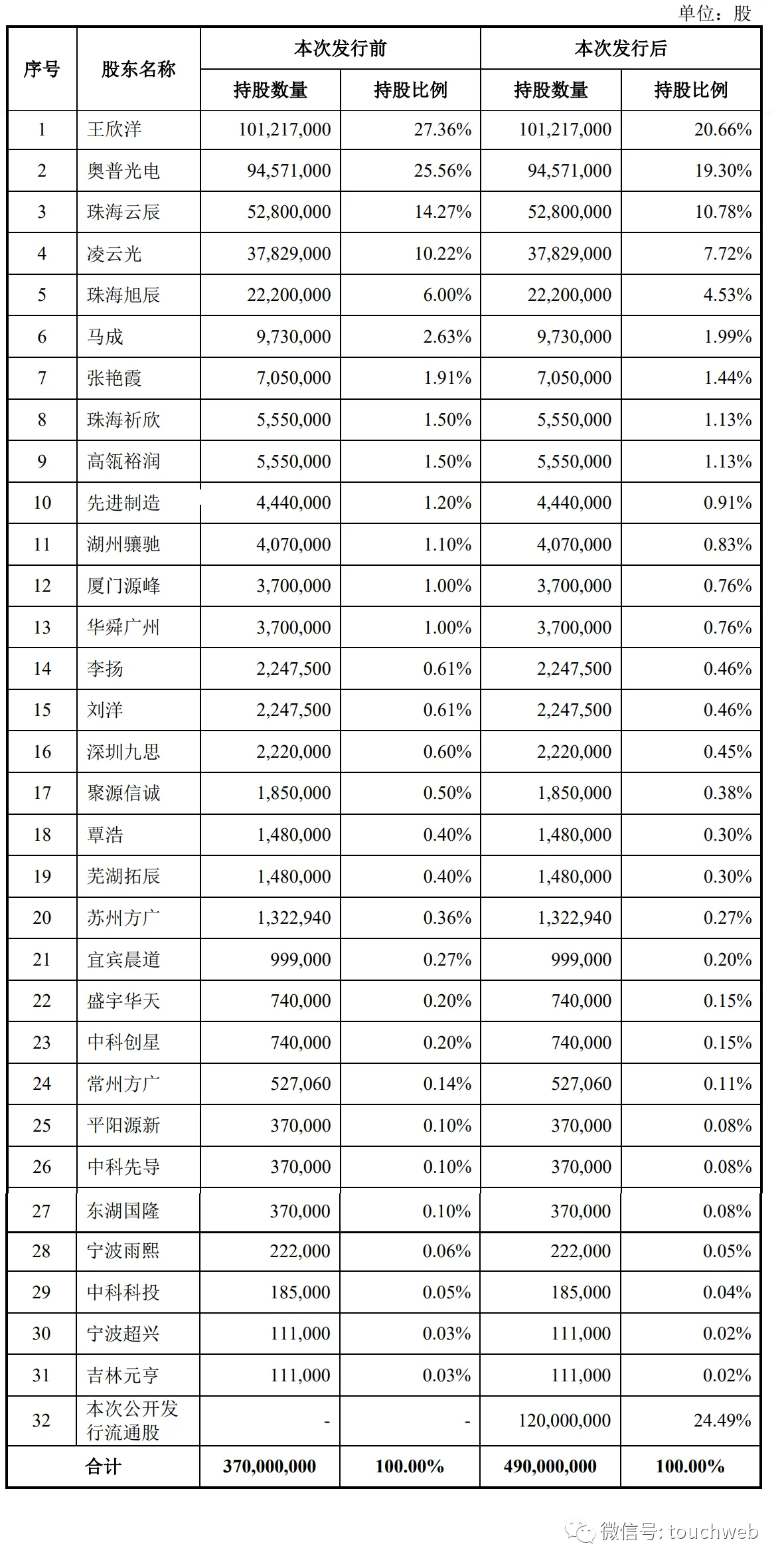 在IPO前,凌云光持股为10.22%,珠海旭辰持股为6%,珠海祈欣、高瓴裕润持股各为1.5%,珠海祈欣、高瓴裕润背后控制人均为高瓴资本,先进制造持股为1.2%,湖州骧驰持股为1.1%,厦门源峰、华舜广州持股各为1%,深圳九思持股为0.6%,聚源信诚持股为0.5%,芜湖拓辰分别持股为0.4%,苏州方广持股为0.36%,宜宾晨道持股为0.27%,盛宇华天、中科创星持股各为0.2%,常州方广持股为0.14%,平阳源新、中科先导、东湖国隆持股各为0.1%。