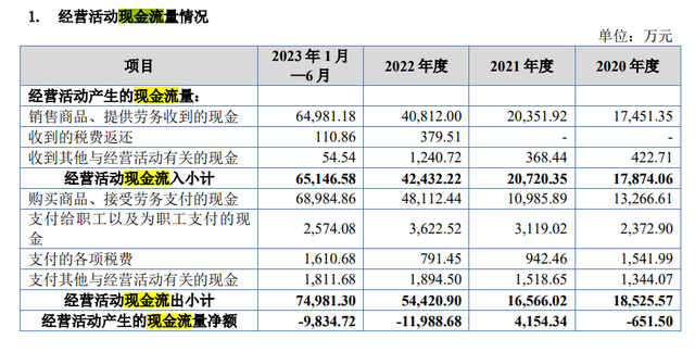 报告期内,天盛股份经营现金流流入分别为2.07亿元、4.24亿元、14.11亿元、5.02亿元,经营现金流流出方面分别为4,154.34万元、-11,988.68万元、-9,764.32万元、-5,035.2万元。