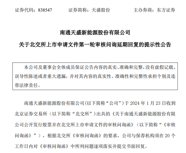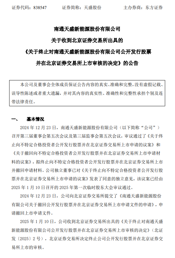 2025年1月10日,因南通天盛新能源股份有限公司(以下简称“天盛股份”)及保荐机构东方证券撤回发行上市申请,北交所决定终止其发行上市审核。