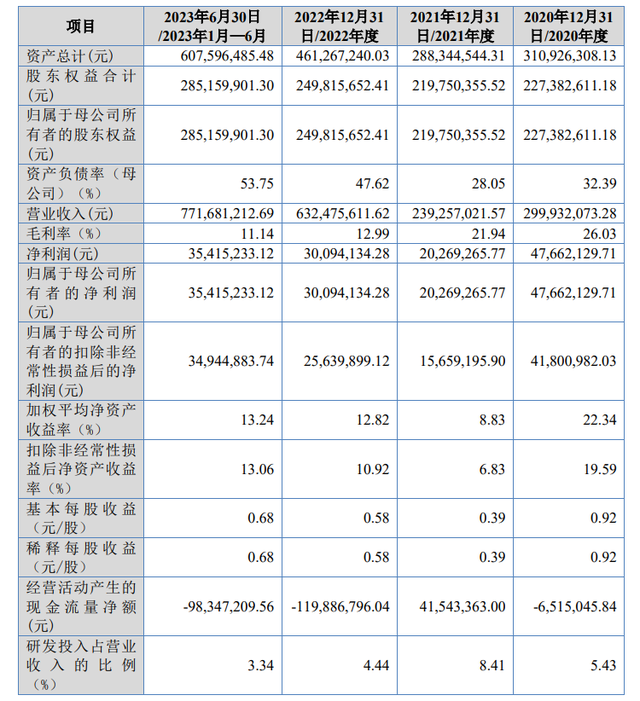 招股书显示,2021年至2024年1-6月(下称“报告期”),天盛股份的营业收入分别为23925.70 万元、63247.56 万元、156803.17 万元、56500.42 万元,营收同比增长率分别为-20.23%、164.35%、147.92%、-26.78%;归母净利润分别为 2026.93 万元、3009.41 万元、5752.08 万元、1555.37 万元,同比增长率分别为-57.47%、48.47%、91.14%、-56.08%。