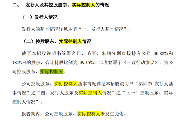目前天盛股份的控股股东、实际控制人毛平、朱鹏已签署《一致行动协议》,毛平、朱鹏分别直接持有天盛股份30.88%和18.27%的股份,两人为一致行动人,合计持有天盛股份 49.15%的股份。