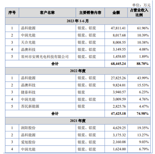 招股书显示,天盛股份的主要产品为晶硅太阳能电池银浆和铝浆。2021年至2024年1-6月,银浆的销售收入分别为1.46亿元、1.07亿元、5.11亿元、14.05亿元、4.33亿元,占主营业务收入的比例分别为49%、44.91%、80.88%、89.58%、88.49%。