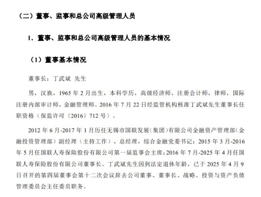 近日,国联人寿保险股份有限公司(下称“国联人寿”)发布的2025年第一季度偿付能力季度报告显示,该公司董事长丁武斌因到法定退休年龄,已于2025年4月9日召开的第四届董事会第十二次会议辞去董事、董事长、战略、投资与资产负债管理委员会主任委员职务。