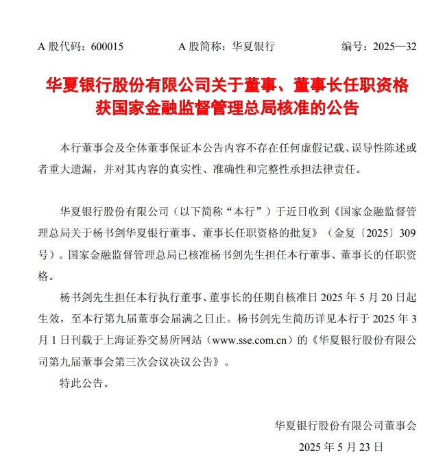 公告显示,杨书剑担任华夏银行执行董事、董事长的任期自核准日2025年5月20日起生效,至该行第九届董事会届满之日止。