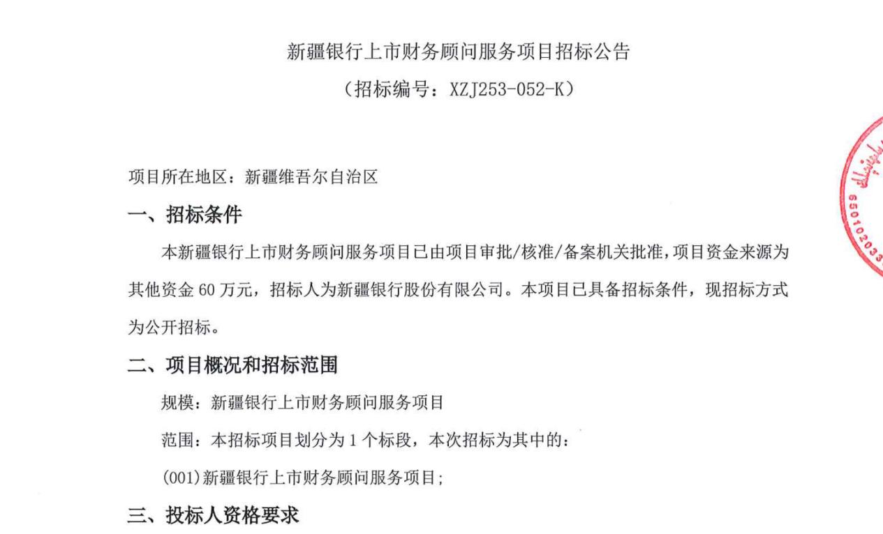 2025年5月16日,一纸上市财务顾问项目于6月11日进行开标的招标公告,将成立不足10年的新疆银行股份有限公司(以下简称“新疆银行”)推至资本市场聚光灯下。这也意味着,该行在2022年初制定的上市时间表已开始启动。