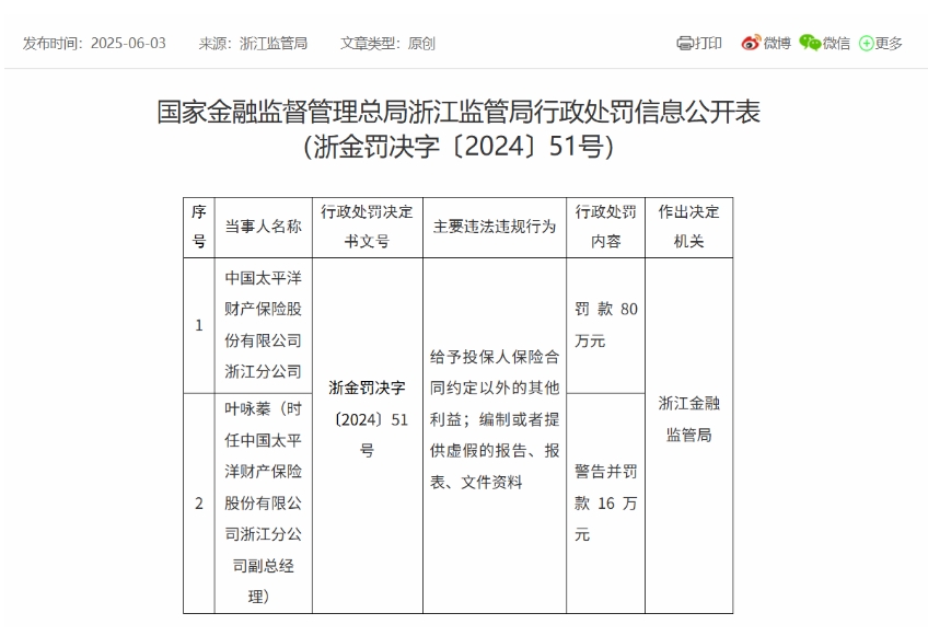 6月3日,国家金融监督管理总局浙江监管局发布的行政处罚信息显示,因给予投保人保险合同约定以外的其他利益,编制或者提供虚假的报告、报表、文件资料,中国太平洋财产保险股份有限公司浙江分公司(下称“太保财险浙江分公司”)被罚款80万元。时任太保财险浙江分公司副总经理叶咏蓁被警告并罚款16万元。
