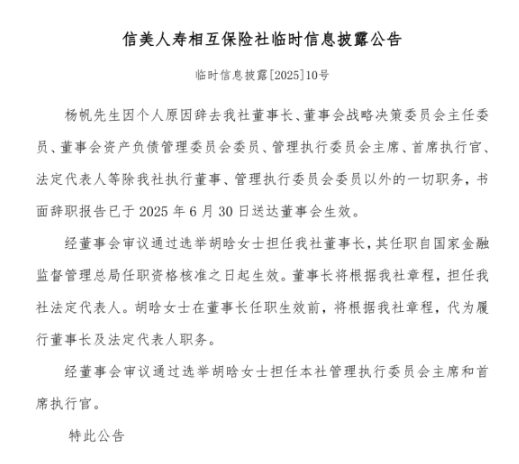 6月30日,信美人寿相互保险社(下称“信美人寿”)发布公告称,杨帆因个人原因辞去该社董事长、董事会战略决策委员会主任委员、董事会资产负债管理委员会委员、管理执行委员会主席、首席执行官、法定代表人等除该社执行董事、管理执行委员会委员以外的一切职务,书面辞职报告已于6月30日送达董事会生效。