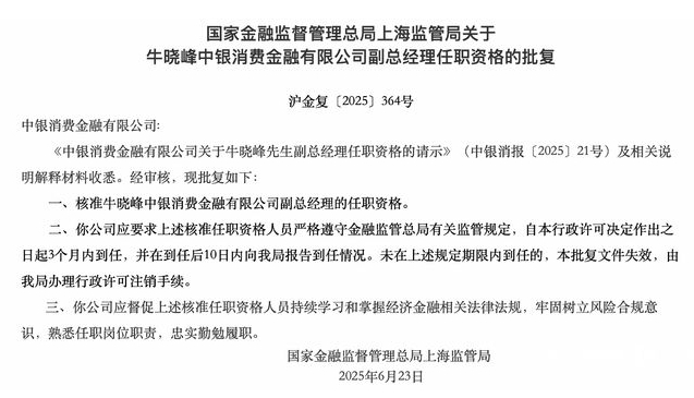 按照监管要求,中银消金应要求牛晓峰严格遵守金融监管总局有关监管规定,自本行政许可决定作出之日起3个月内到任,并在到任后10日内报告到任情况。未在上述规定期限内到任的,本批复文件失效,由国家金融监督管理总局上海监管局办理行政许可注销手续。