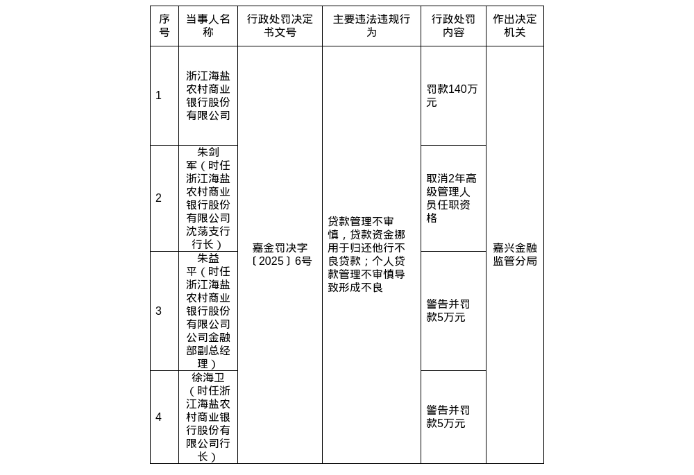 此外,时任浙江海盐农商行沈荡支行行长朱剑军,被取消2年高级管理人员任职资格;时任浙江海盐农商行公司金融部副总经理朱益平,被警告并处罚款5万元;时任浙江海盐农商行行长徐海卫,被警告并处罚款5万元。