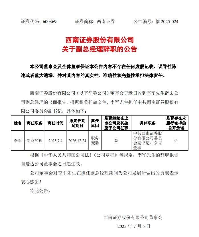 7月4日,西南证券股份有限公司(下称“西南证券”)发布公告称,董事会于近日收到李军因职务变动辞去副总经理的书面报告。根据相关任命文件,李军担任西南证券股份有限公司委员会副书记、董事。