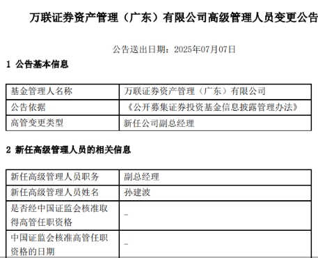 7月7日,万联证券资产管理(广东)有限公司(下称“万联资管”)发布公告称,孙建波自7月4日起新任公司副总经理。