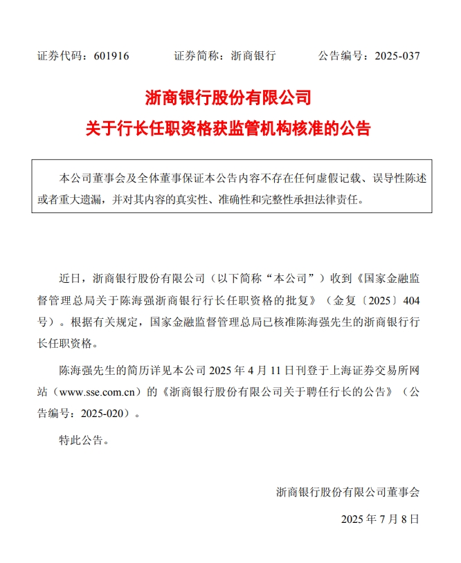 7月8日,浙商银行股份有限公司(下称“浙商银行”)发布公告称,近日收到《国家金融监督管理总局关于陈海强浙商银行行长任职资格的批复》,陈海强的浙商银行行长任职资格已获核准。