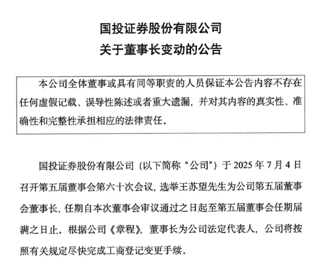 近日,国投证券股份有限公司(下称“国投证券”)发布公告称,于7月4日召开第五届董事会第六十次会议,选举王苏望为第五届董事会董事长,任期自本次董事会审议通过之日起至第五届董事会任期届满之日止。