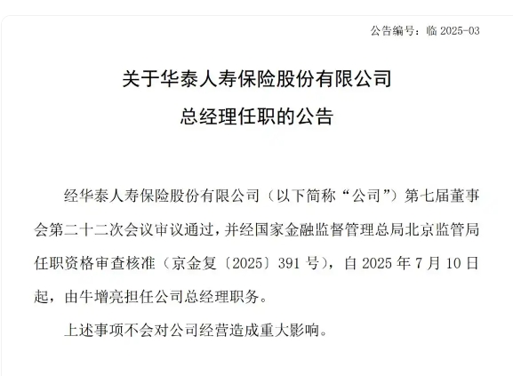 7月10日,华泰人寿保险股份有限公司(下称“华泰人寿”)发布公告称,经华泰人寿第七届董事会第二十二次会议审议通过,并经国家金融监督管理总局北京监管局任职资格审查核准,自2025年7月10日起,牛增亮担任华泰人寿总经理职务。