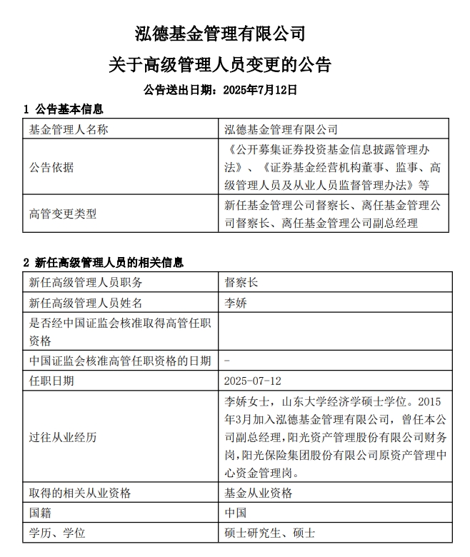7月12日,泓德基金管理有限公司(下称“泓德基金”)发布高级管理人员变更的公告,任职超过10年的督察长李晓春正式退休,李娇离任副总经理,转任督察长。