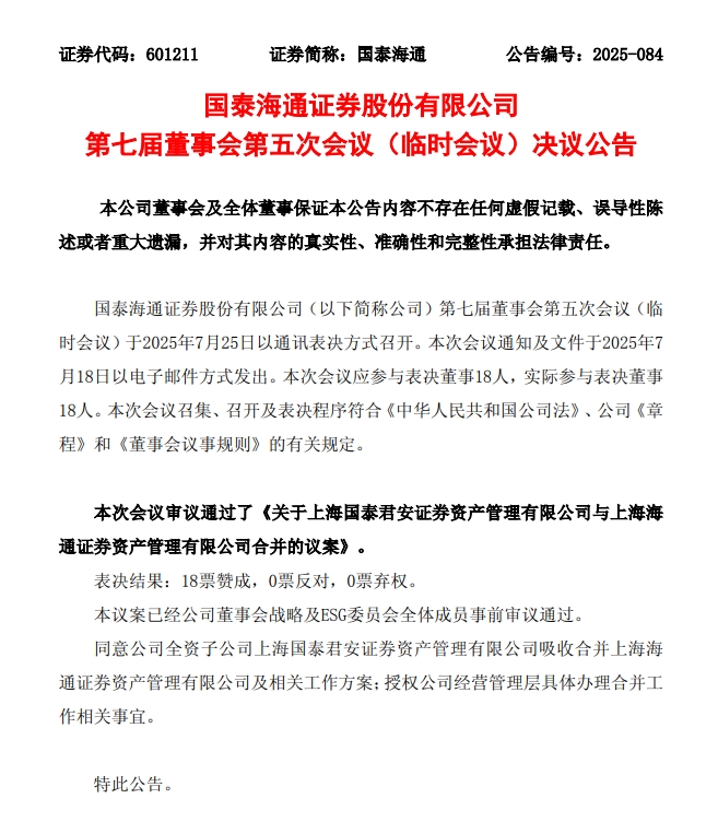 7月25日晚间,国泰海通发布公告,宣告董事会审议同意国泰君安资管吸收合并海通资管及相关工作方案。同日,国泰君安资管发布公告称,公司名称变更为“上海国泰海通证券资产管理有限公司”。