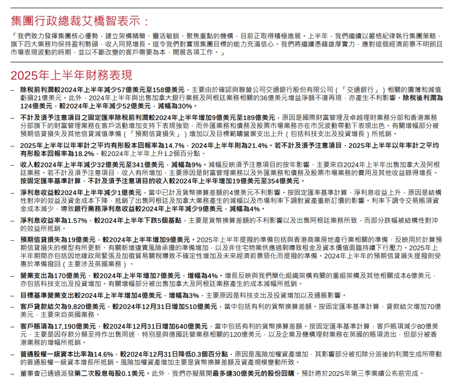 公告还显示,汇丰控股除税前利润较2024年上半年减少57亿美元至158亿美元,主要由于确认与联营公司交通银行股份有限公司相关的摊薄和减值亏损21亿美元。此外,2024年上半年与出售加拿大银行业务及阿根廷业务相关的36亿美元增益净额不复再现,亦产生不利影响。