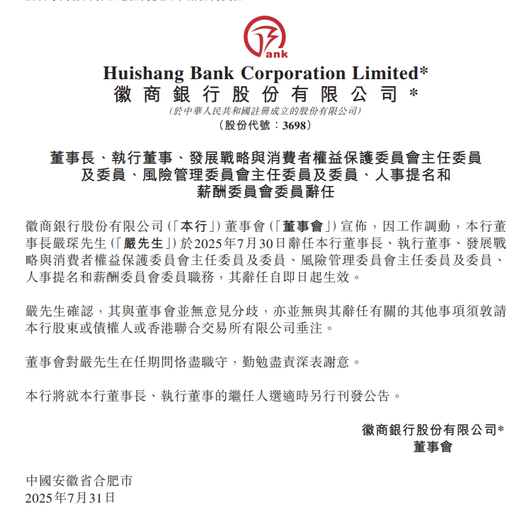 7月31日,徽商银行股份有限公司(下称“徽商银行”)发布公告称,因工作调动,该行董事长严琛于2025年7月30日辞任该行董事长、执行董事、发展战略与消费者权益保护委员会主任委员及委员、风险管理委员会主任委员及委员、人事提名和薪酬委员会委员职务,其辞任自即日起生效。