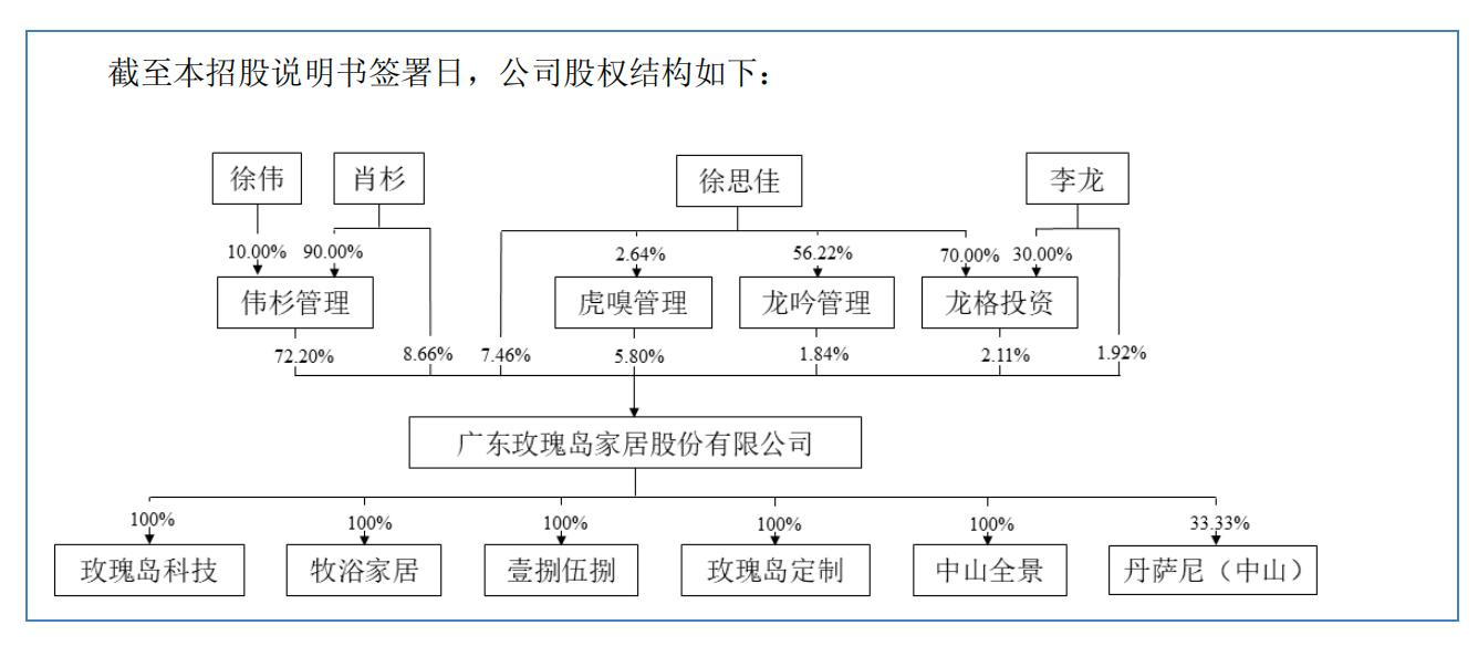 最新的招股书显示,玫瑰岛控股股东伟杉管理(肖杉持股90%、徐伟持股10%)持有玫瑰岛72.2%股份,肖杉个人持股8.7%,女儿徐思佳持股7.5%。加上徐思佳丈夫、公司董秘李龙持有的1.92%股份,徐氏家族直接控制股份比例高达92.27%。