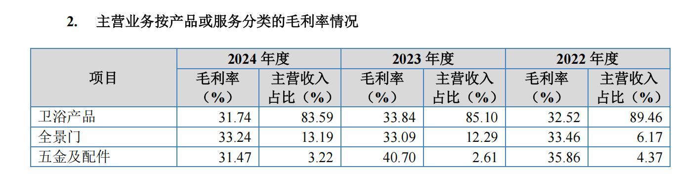 在玫瑰岛的收入结构中,卫浴产品作为收入大头,每年贡献的收入基本都在80%以上。但近期,卫浴产品产生的毛利率却开始走低,2024年卫浴产品毛利率同比下降了1.51个百分点。玫瑰岛在年报中称,2024年在零售业务推出更多低价产品,使得卫浴产品的销售单价有所下降。
