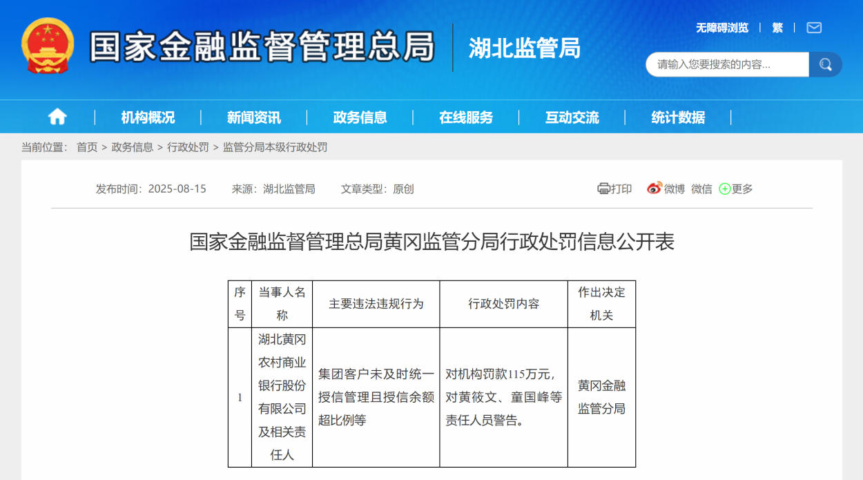 8月15日,国家金融监督管理总局黄冈监管分局发布的行政处罚信息公开表显示,湖北黄冈农村商业银行股份有限公司(下称“黄冈农商行”)被处罚款115万元,因集团客户未及时统一授信管理且授信余额超比例等违法违规行为,相关责任人黄筱文、童国峰等被予以警告。