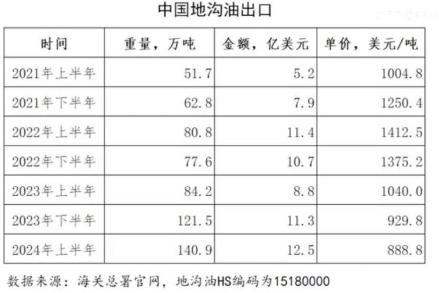 我国是废弃油脂生产大国,废弃油脂回收、二次生产等业务潜力巨大。从2023年开始,我国就已经成为全球废弃食用油最大的出口国。海关总署的数据显示,2023年,中国出口了超过200万吨废弃食用油,占国内废弃食用油生产的一半以上,创历史新高。2024年上半年,中国已出口140.9万吨废弃食用油,前三大进口国分别为美国、新加坡和印度尼西亚。
