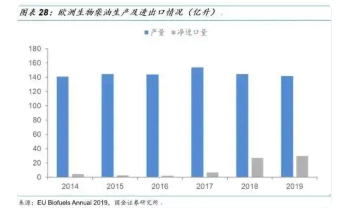 但到了2018年,事情迎来了转机,由于《可再生能源指令》,欧洲生物柴油进口需求暴涨。根据国金证券研报,2018年,欧洲生物柴油净进口量已超过30亿升,需求量是2017年的3倍。突如其来的机遇,给几近分崩离析的丰倍生物指明了方向。