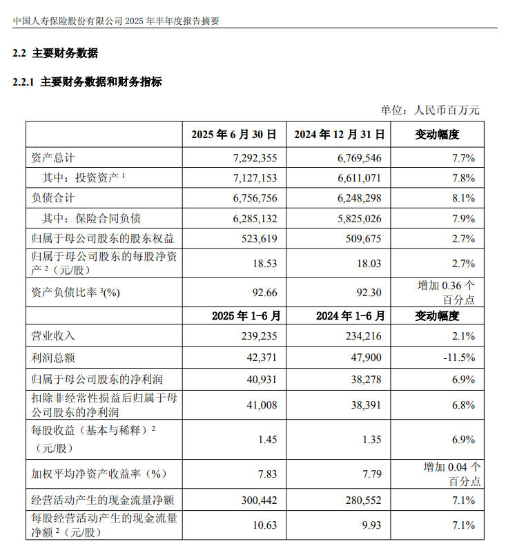 8月27日晚间,中国人寿保险股份有限公司(601628.SH,02628.HK,下称“中国人寿”)发布2025年半年度报告。2025年上半年,中国人寿实现营业收入2392.35亿元,同比增长2.1%;实现归属于母公司股东的净利润409.31亿元,同比增长6.9%;总保费收入为5250.88亿元,创历史同期最好水平,同比增长7.3%。