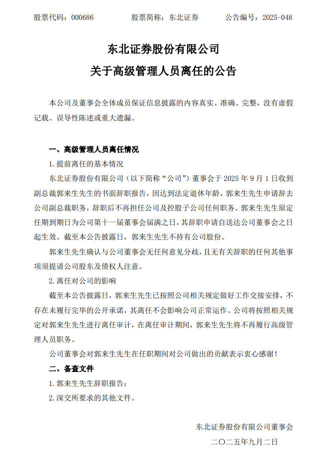 9月1日,东北证券发布公告称,收到副总裁郭来生的书面辞职报告,因达到法定退休年龄,郭来生申请辞去副总裁职务,辞职后不再担任该公司及控股子公司任何职务。郭来生原定任期到期日为第十一届董事会届满之日,其辞职申请自送达董事会之日起生效。