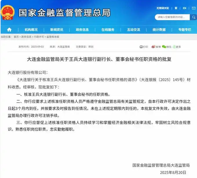 9月3日,大连金融监管局发布《关于王兵大连银行副行长、董事会秘书任职资格的批复》,核准王兵大连银行副行长、董事会秘书的任职资格。