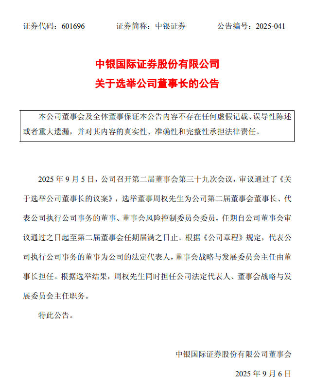 9月5日,中银国际证券股份有限公司(601696.SH,下称“中银证券”)发布公告称,该公司召开第二届董事会第三十九次会议,审议通过了关于选举董事长的议案,选举董事周权为第二届董事会董事长,任期自董事会审议通过之日起至第二届董事会任期届满之日止。周权同时担任法定代表人及董事会战略与发展委员会主任职务。