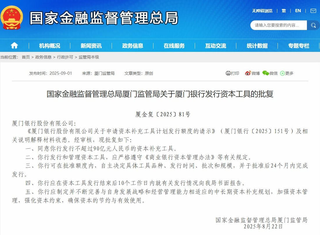 9月1日,国家金融监管总局网站披露金融监督管理总局厦门监管局关于厦门银行股份有限公司(601187.SH,下称“厦门银行”)发行资本工具的批复。批复称,同意该行发行不超过90亿元的资本补充工具。该行发行和管理资本工具,应严格遵守《商业银行资本管理办法》等有关规定。该行可在批准额度内,自主决定具体工具品种、发行时间、批次和规模,并于批准后24个月内完成发行。