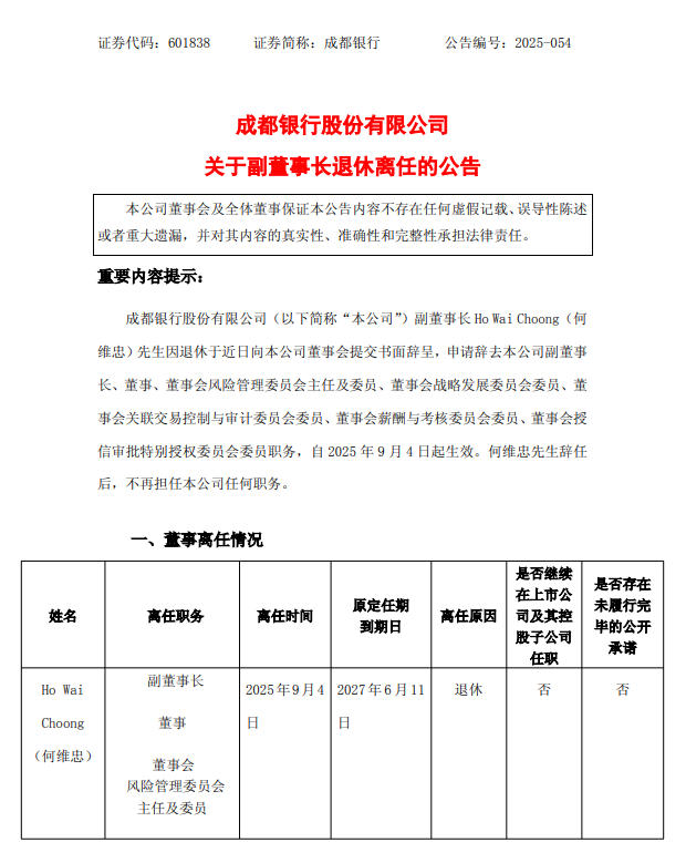 9月4日晚间,成都银行股份有限公司(601838.SH,下称“成都银行”)发布公告称,近日,副董事长Ho Wai Choong(何维忠)因退休向董事会提交书面辞呈,申请辞去副董事长、董事、董事会风险管理委员会主任及委员、董事会战略发展委员会委员、董事会关联交易控制与审计委员会委员、董事会薪酬与考核委员会委员、董事会授信审批特别授权委员会委员职务,自2025年9月4日起生效,何维忠辞任后,不再担任成都银行任何职务。