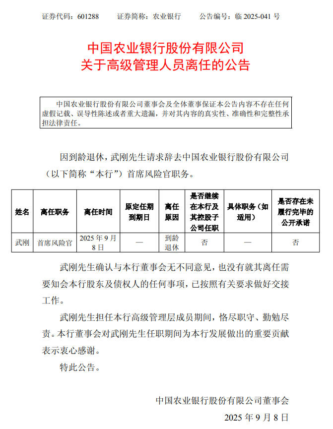 9月8日,中国农业银行股份有限公司(601288.SH,下称“农业银行”)发布公告称,因到龄退休,武刚请求辞去首席风险官职务。
