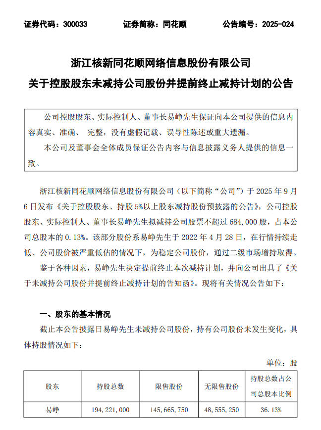 发布股东减持公告仅一个工作日后,9月9日凌晨,浙江核新同花顺网络信息股份有限公司(300033.SZ,下称“同花顺”)再次发布公告称,鉴于各种因素,董事长易峥决定提前终止本次减持计划。