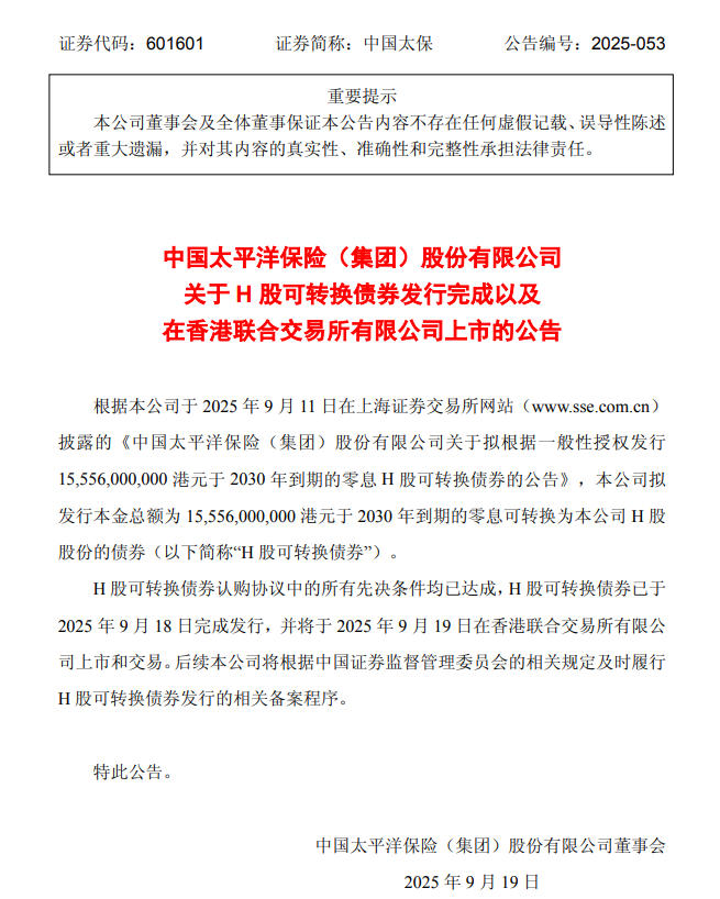 9月18日,中国太平洋保险股份有限公司(601601.SH/02601.HK,下称“中国太保”)发布公告称,已完成发行总额为155.56亿港元的零息可转换债券,该债券将于2030年到期。