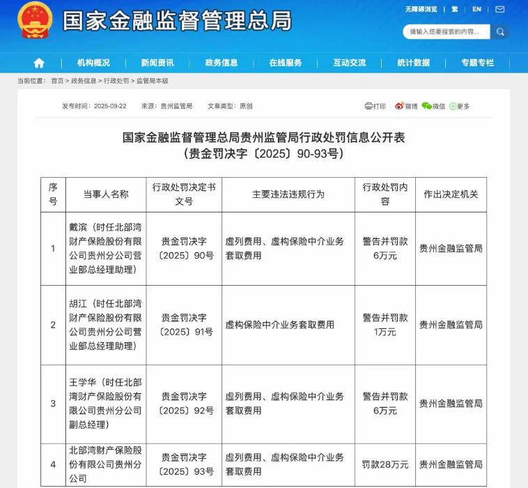 9月22日,贵州金融监管局发布的行政处罚信息显示,北部湾财产保险股份有限公司贵州分公司(下称“北部湾保险贵州分公司”)因虚列费用、虚构保险中介业务套取费用,被罚款28万元。时任该公司副总经理王学华、营业部总经理助理戴滨分别被警告并被罚款6万元,该公司营业部总经理助理胡江被警告并被罚款1万元。