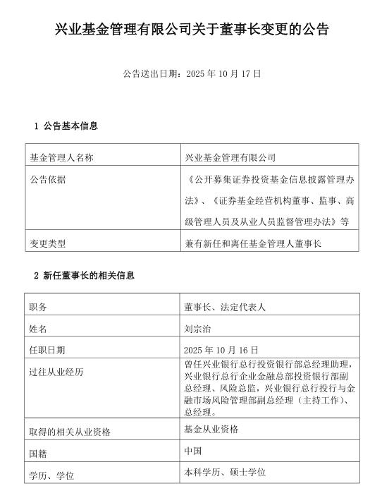 10月17日,兴业基金管理有限公司(下称“兴业基金”)发布董事长变更公告称,董事长、法定代表人叶文煌因年龄原因离任,刘宗治接任。公告履历显示,刘宗治曾任兴业银行总行投资银行部总经理助理,兴业银行总行企业金融总部投资银行部副总经理、风险总监,兴业银行总行投行与金融市场风险管理部副总经理(主持工作)、总经理。