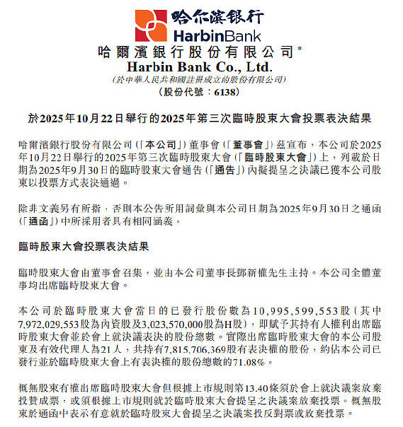 10月22日,哈尔滨银行股份有限公司(06138.HK,下称“哈尔滨银行”)发布公告称,该行2025年第三次临时股东大会投票审议并通过了四项议案,包括审议并批准关于吸收合并重庆市大渡口融兴村镇银行改建支行的议案、审议并批准关于吸收合并重庆市沙坪坝融兴村镇银行改建支行的议案、审议并批准关于吸收合并重庆市武隆融兴村镇银行改建支行的议案,以及审议并批准关于吸收合并讷河融兴村镇银行改建支行的议案。