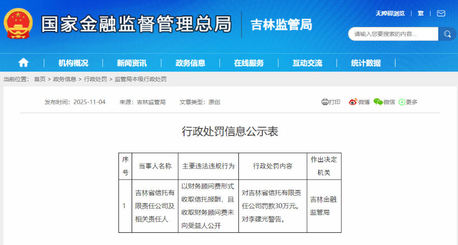 11月4日,国家金融监督管理总局吉林监管局披露的行政处罚信息公示表显示,因以财务顾问费形式收取信托报酬,且收取财务顾问费未向受益人公开,吉林省信托有限责任公司(下称“吉林信托”)被罚款30万元,相关责任人李建光被警告。