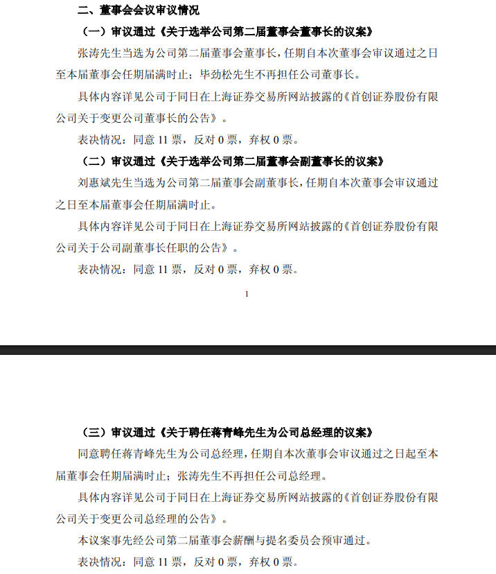 11月19日,首创证券股份有限公司(601136.SH,下称“首创证券”)发布公告称,张涛当选为第二届董事会董事长,毕劲松到龄退休不再担任董事长。刘惠斌当选为第二届董事会副董事长。同时,董事会同意聘任蒋青峰为总经理,张涛因工作安排调整不再担任总经理。上述人员的任期自本次董事会审议通过之日起至本届董事会任期届满时止。