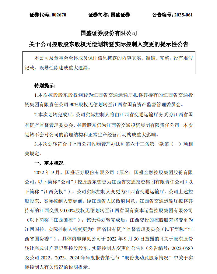 11月19日,国盛证券股份有限公司(002679.SZ,下称“国盛证券”)发布公告称,收到控股股东江西交投的《告知函》,经江西省人民政府同意,江西省交通运输厅拟将其持有的江西交投90.00%股权由无偿划转至江西国控调整为直接无偿划转至江西省国资委。本次划转完成后,国盛证券实际控制人将由江西省交通运输厅变更为江西省国资委,控股股东仍为江西交投。此次股权无偿划转符合相关法律法规规定,不会对公司治理及生产经营产生重大影响。