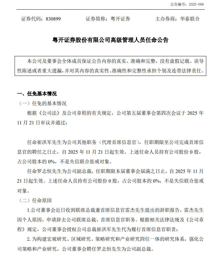 11月24日,粤开证券股份有限公司(830899.NQ,下称“粤开证券”)发布高管变动公告,因个人原因,雷杰辞去联席总裁、首席信息官职务,自2025年11月20日起辞任生效。