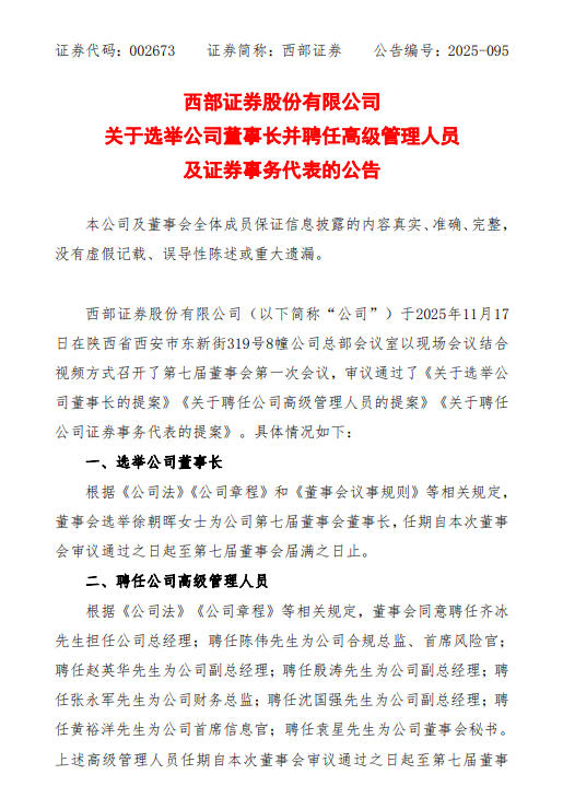 11月17日,西部证券股份有限公司(002673.SZ,下称“西部证券”)发布公告表示,于11月17日召开第七届董事会第一次会议,选举徐朝晖为第七届董事会董事长。同时,董事会同意聘任齐冰担任总经理;聘任陈伟为合规总监、首席风险官;聘任赵英华为副总经理;聘任殷涛为副总经理;聘任张永军为财务总监;聘任沈国强为副总经理;聘任黄裕洋为首席信息官;聘任袁星为董事会秘书。另外,董事会聘任袁星为证券事务代表。