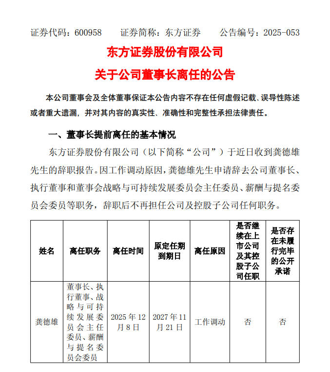 12月8日,东方证券股份有限公司(600958.SH/03958.HK,下称“东方证券”)发布公告称,于近日收到龚德雄的辞职报告,因工作调动原因,龚德雄申请辞去董事长、执行董事和董事会战略与可持续发展委员会主任委员、薪酬与提名委员会委员等职务,辞职后不再担任东方证券及控股子公司任何职务。