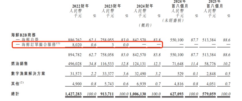 相比之下,此前叶宁引以为傲的海鲜撮合服务收入却在逐渐收缩,从2021年的1340万元下降99.72%至2023年的3.4万元,甚至到了2024年直接停掉该业务。