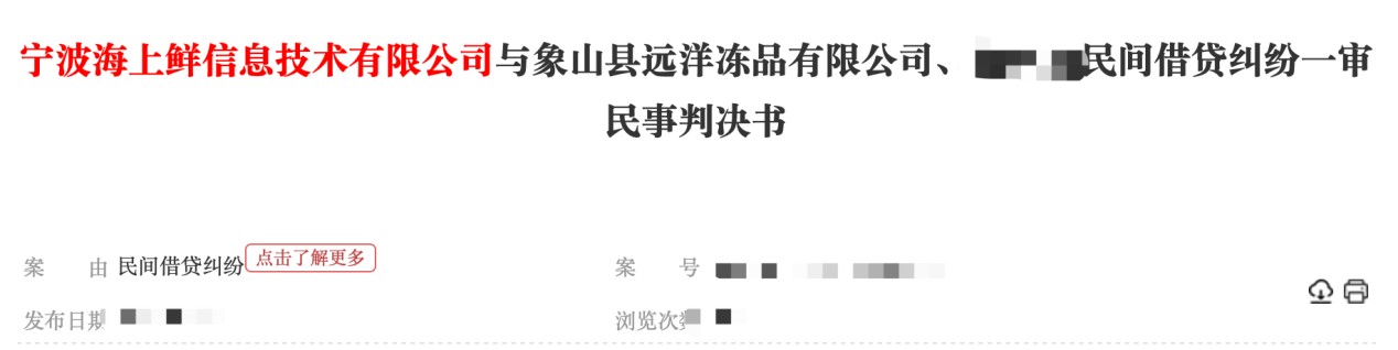 据中国裁判文书网的一则判决书,2017年,海上鲜与远洋冻品公司签订了一份融资合同,同意提供最高80万元的贷款。判决书显示,双方签订合同约定的逾期利率为日利率1‰(对应的年化利率是36.5%),超出了法律规定的年利率24%的上限,已涉及“高利贷”范畴。