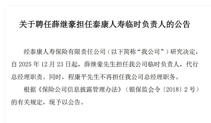 12月26日,泰康人寿保险有限责任公司(下称“泰康人寿”)发布公告称,自2025年12月23日起,薛继豪担任临时负责人,代行总经理职责,程康平不再担任总经理职务。